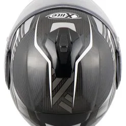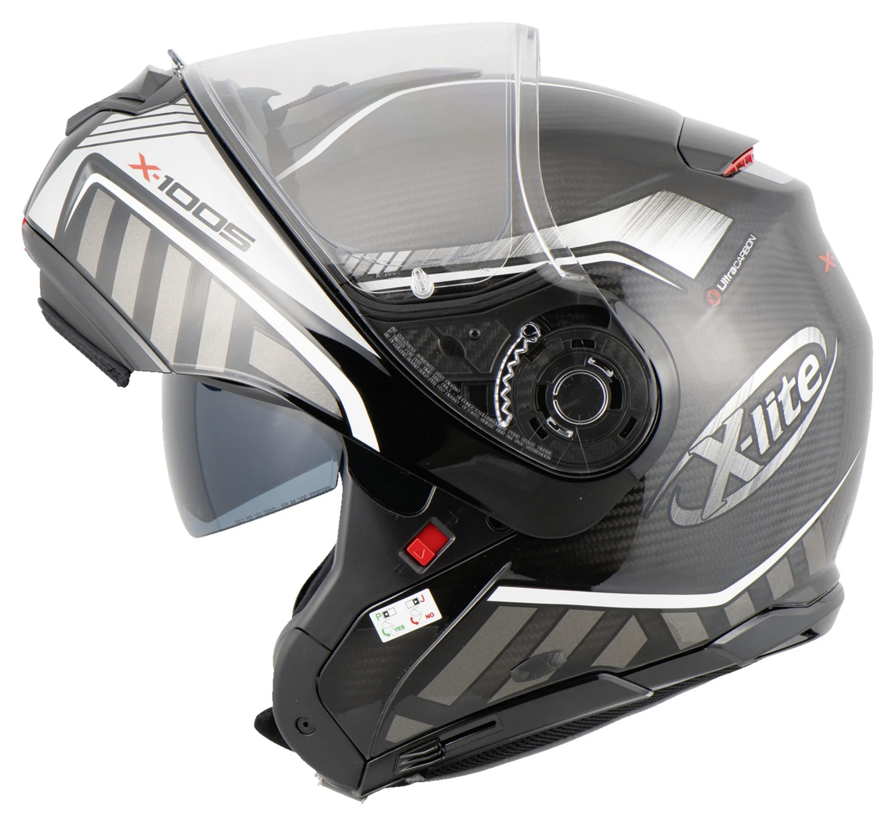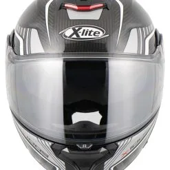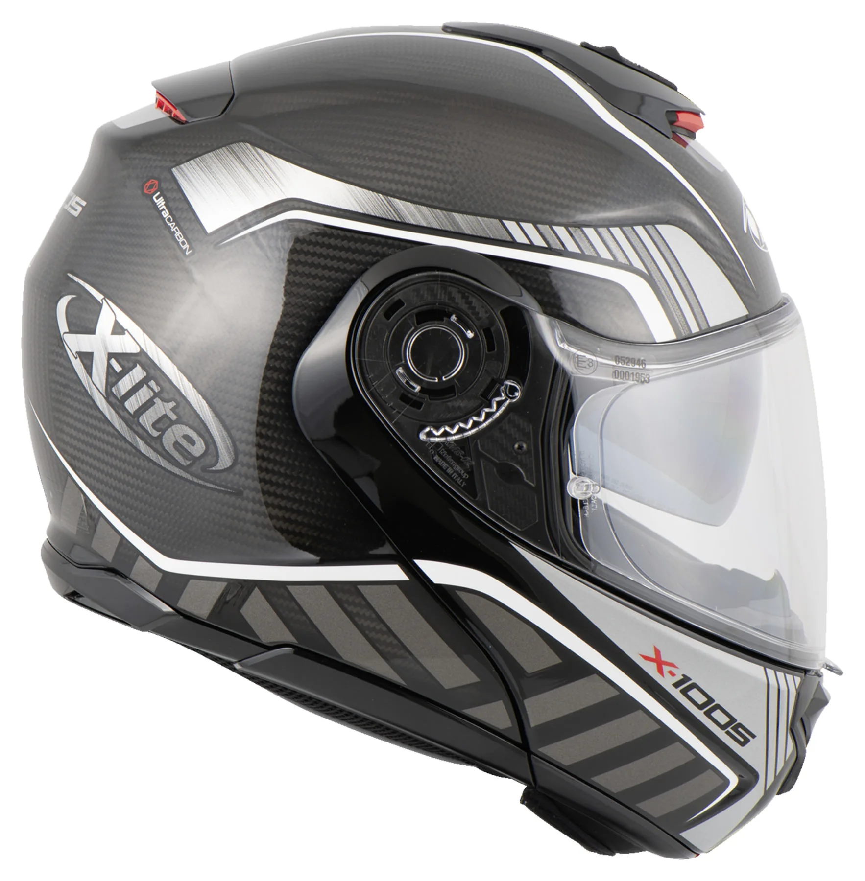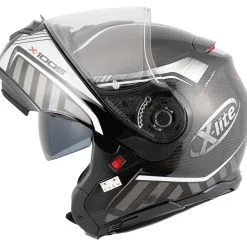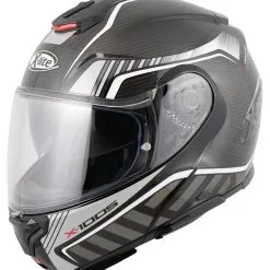 After the successful *X-1004* X-lite shows with the *X-1005* what Italians understand by innovative helmet design, thought-out to the smallest detail construction and high-quality material selection. Here the exclusive *X-1005 Ultra Carbon* flip-up helmet version. This great carbon head protector features an elegant and dynamic design, eye-catching appearance and a variety of innovative technical features. The use of carbon makes this “flapper” very light, which makes it especially recommended for long distances and big tours. Other highlights include three helmet shell sizes, the large field of vision or even the elliptical track in which the chin guard can be pushed up. An opened *X-1005* (as a jet helmet) drives itself thereby substantially more pleasantly. The X-lite *X-1005 Ultra Carbon* is just right for demanding motorcyclists.